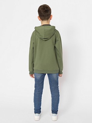 Толстовка для мальчика с капюшоном и карманом "кенгуру" спереди. Капюшон с подкладкой. Рукава длинные, с манжетами по низу. Низ изделия оформлен притачным поясом. Пояс и манжеты выполнены из полотна с эластаном. На левый рукав настрочена жаккардовая этикетка, на карман нанесен принт.
