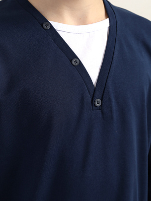 Джемпер с длинным втачным рукавом. Воротник с вырезом и имитацией футболки, по краю ланки воротника расположены декоративные пуговицы.