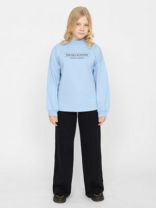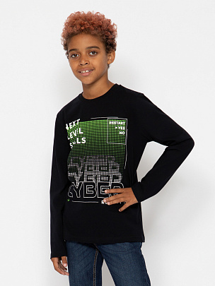 Джемпер для мальчика свободного силуэта с карманом спереди и притачным эластичным поясом по низу. Горловина круглая, обработана притачным воротником из полотна с эластаном. Рукава длинные с эластичными манжетами по низу. Перед джемпера декорирован принтом "Маленькие шаги приводят к большим переменам".